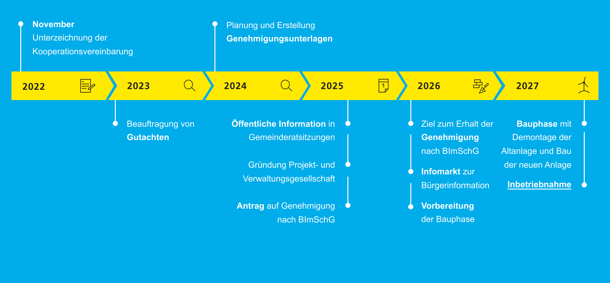 Erst nach Genehmigungserteilung kann mit der Bauvorbereitung, der Demontage der Altanlage und dem anschließenden Neubau begonnen werden. Die Errichtung und den Betrieb der neuen Windenergieanlage verantwortet die neu gegründete Gesellschaft. Die Windenergieanlage soll 2027 in Betrieb gehen und in den nächsten 30 Jahren klimafreundlich Strom produzieren.